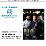 Το Σάββατο 23 Αυγούστου,ταξιδεύουμε στον κόσμο του λαϊκού τραγουδιού,στο Κηποθέατρο “Μάνος Χατζιδάκις”. Ο Γιώργος Σηφάκης και το συγκρότημά του, ζωντανεύουν δημιουργίες κορυφαίων Ελλήνων συνθετών .Μια βραδιά με αυθεντικό λαϊκό παλμό και τραγούδια του χθές και του σήμερα. Τραγούδι: Γιώργος Σηφάκης.Μπουζούκι: Γιώργος ΠαναγόπουλοςΠλήκτρα: Δημήτρης Παναγόπουλος Σάββατο 23 Αυγούστου,στο Κηποθέατρο “Μάνος Χατζιδάκις”.Ώρα έναρξης 21:00.Είσοδος ελεύθερη. Διοργάνωση: Περιφέρεια […]